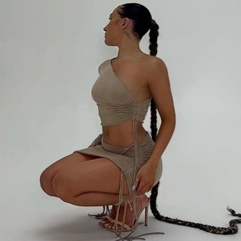 One Shoulder Midriff-baring Top Side Drawstring Skirt Suit