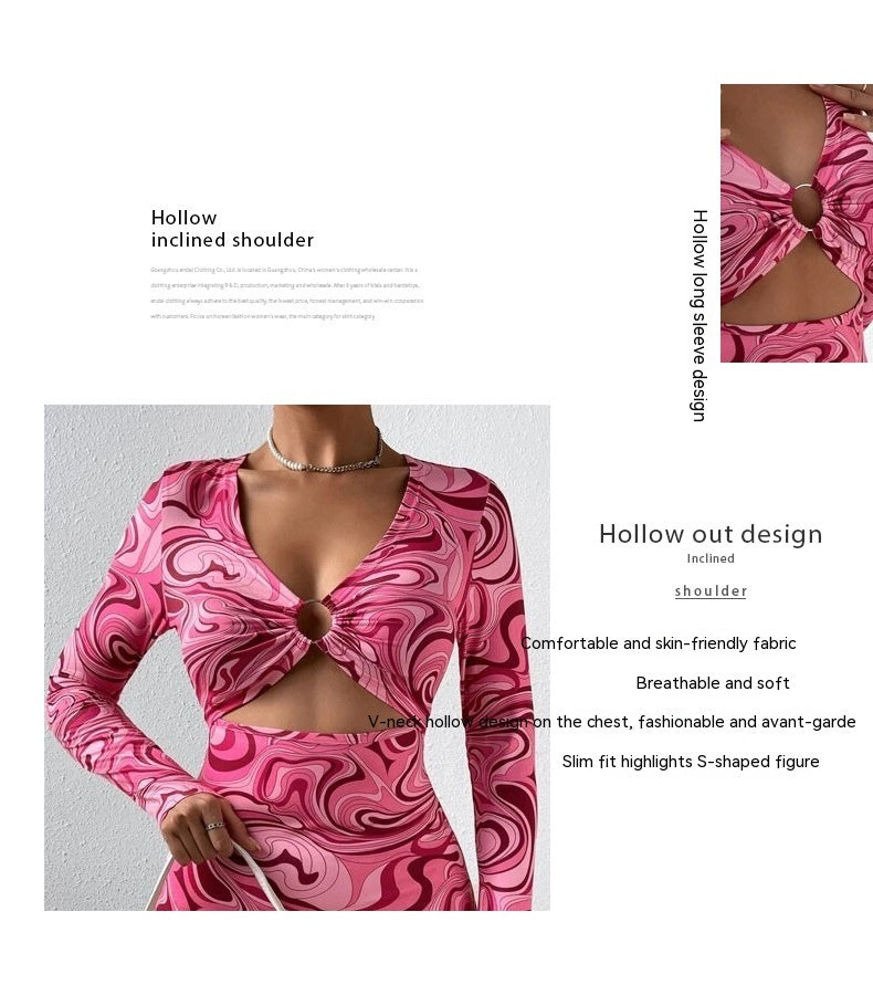 Sexy Long Sleeve Printed Hollow Out V-neck Slim Fit Hip Skirt