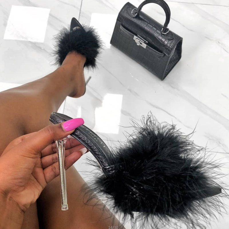 Woman Shoes Transparent Crystal High Heels Woman Feather Fur Slippers